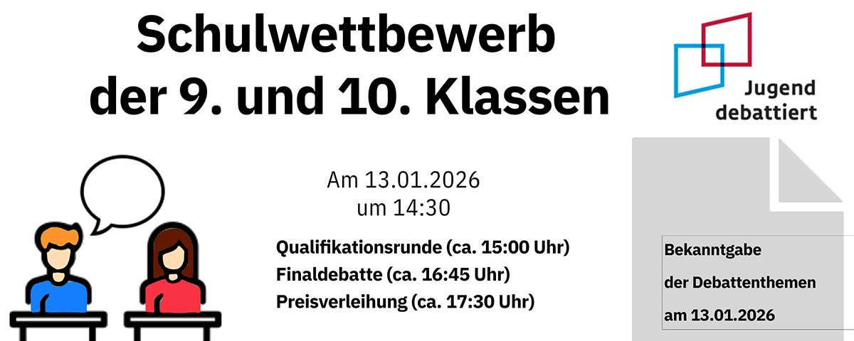 Mit Spannung sehen wir unserem ersten Schulwettbewerb "Jugend debattiert" am 23. Januar 2026 entgegen, in dem die Teams aus den 9. und 10. Klassen gegeneinander antreten werden. Wir freuen uns auf überzeugende Argumente und geschliffene Rhetorik - auf eine Denbattenkultur, die aktuell besonders wertvoll und erstrebenswert erscheint.