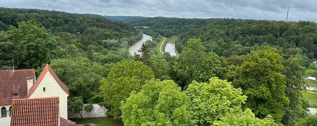 Nach 15 Minuten Fußweg hatten wir dann die Burg erreicht. Als erstes sind wir auf dem Turm geklettert. Hierbei haben wir gewettet, wer die Anzahl der Stufen am genauesten schätzt. Die meisten von uns lagen viel zu hoch, weil sich der Weg nach oben ganz schön lang anfühlte und die Stufen steil, eng und ausgetreten waren. Tatsächlich waren es aber nur 115 Stufen. Der Aufstieg lohnte sich aber definitiv, da man von oben einen super Blick über die Isar, den Wald und schicke Häuser in Grünwald hatte. Aber klar - früher war das ja ein Wachturm, da musste man natürlich von weitem sehen können, ob sich ein feindliches Heer näherte!