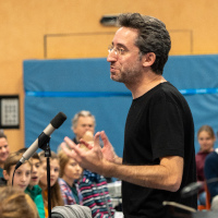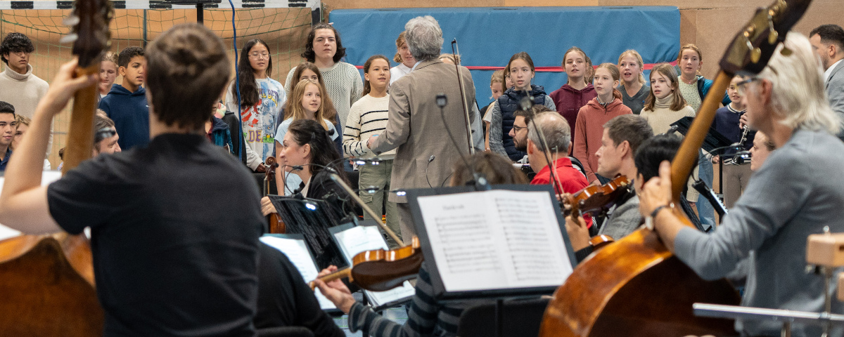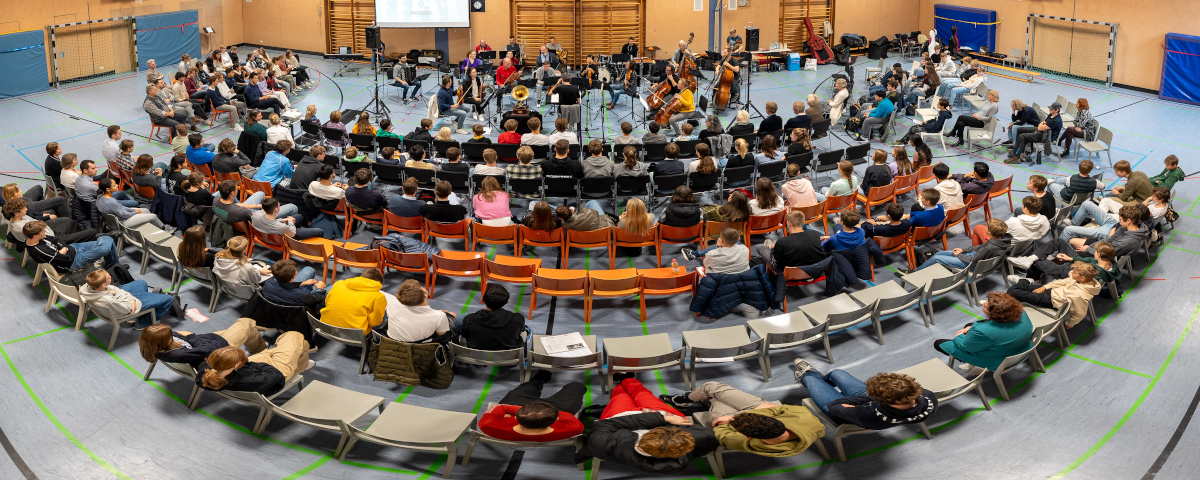 180 SchülerInnen und einige LehrerInnen erlebten in der 90-minütigen Probe professionelle Orchestermusik vom Feinsten. Mit „Klezmer – reconstructed“ wurde ein Auftragswerk geprobt, das den Etappen einer jüdischen Hochzeit folgt. Dabei greift die Musik osteuropäische Klezmer-Musik auf, verarbeitet sie weiter und streut abstrakte moderne Klangexperimente mit ein. Das Publikum war begeistert: