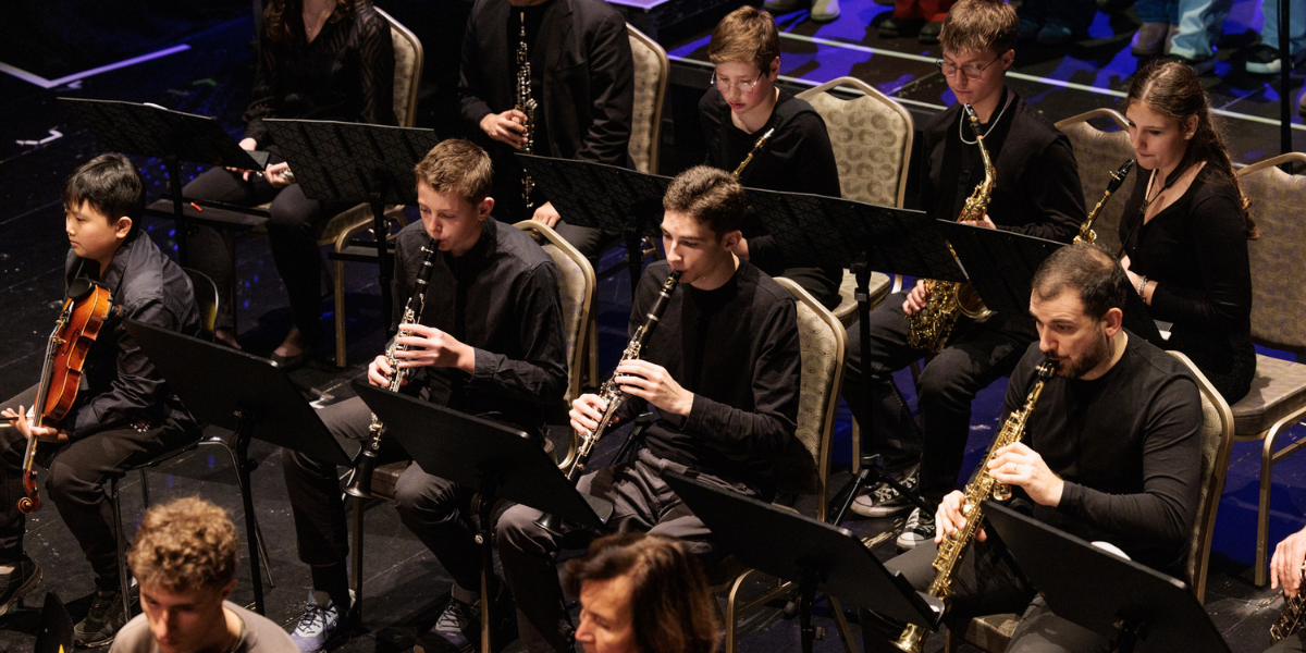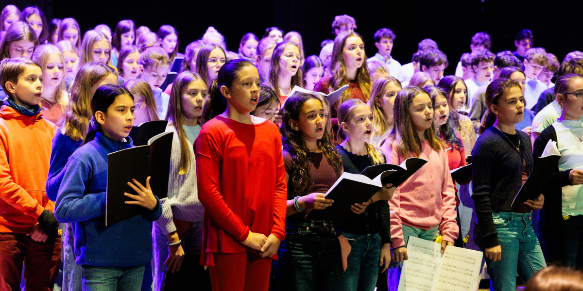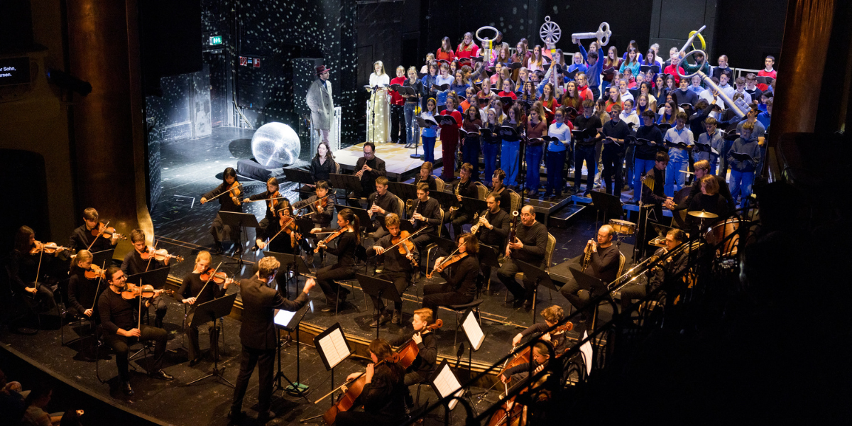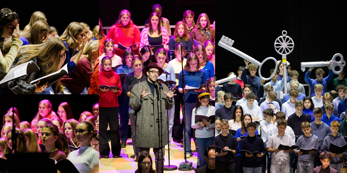 Als am 23.11.2025 in den Münchner Kammerspielen ein besonderes Konzertprojekt auf die Bühne kommt, sind auch unsere Schülerinnen und Schüler mit dabei. Unser Chor und einige Instrumentalistinnen und Instrumentalisten hatten vom Jewish Chamber Orchestra Munich (JCOM) die Einladung erhalten, gemeinsam mit den Chören zweier weiterer Schulen an der Aufführung des neu komponierten Werks „Die Tore von Sepharad“ von Gustavo Strauß mitzuwirken.