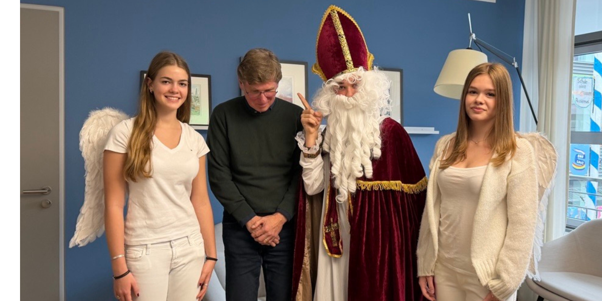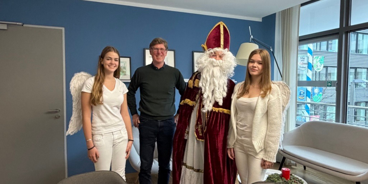 Ein gestrenger Nikolaus machte am Freitag auch im Büro unseres Schulleiters Station - und hatte offensichtlich ein paar mahnende Worte parat. Dass sich in Begleitung seiner beiden Engel am Ende doch das Wohlwollen durchsetzte, kann man deutlich erkennen - und auch die mitgebrachten Gaben, Mandarinen und ein Schokoladennikolaus, zeigten es.