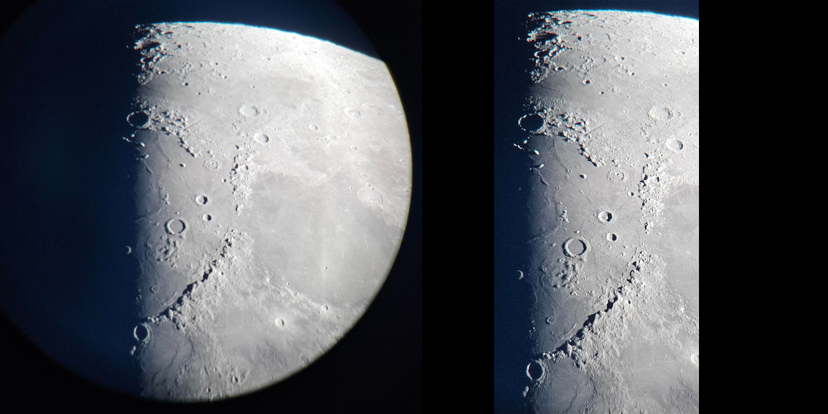 Interessierte Schüler, Eltern und Lehrer konnten live durch das Teleskop die Mondkrater in großer Vergrößerung sehen. Die Sichtbedingung waren erstaunlich gut, so dass die Bilder gestochen scharf waren. Die beiden mit dem Handy gemachten Aufnahmen geben hiervon einen Eindruck.
