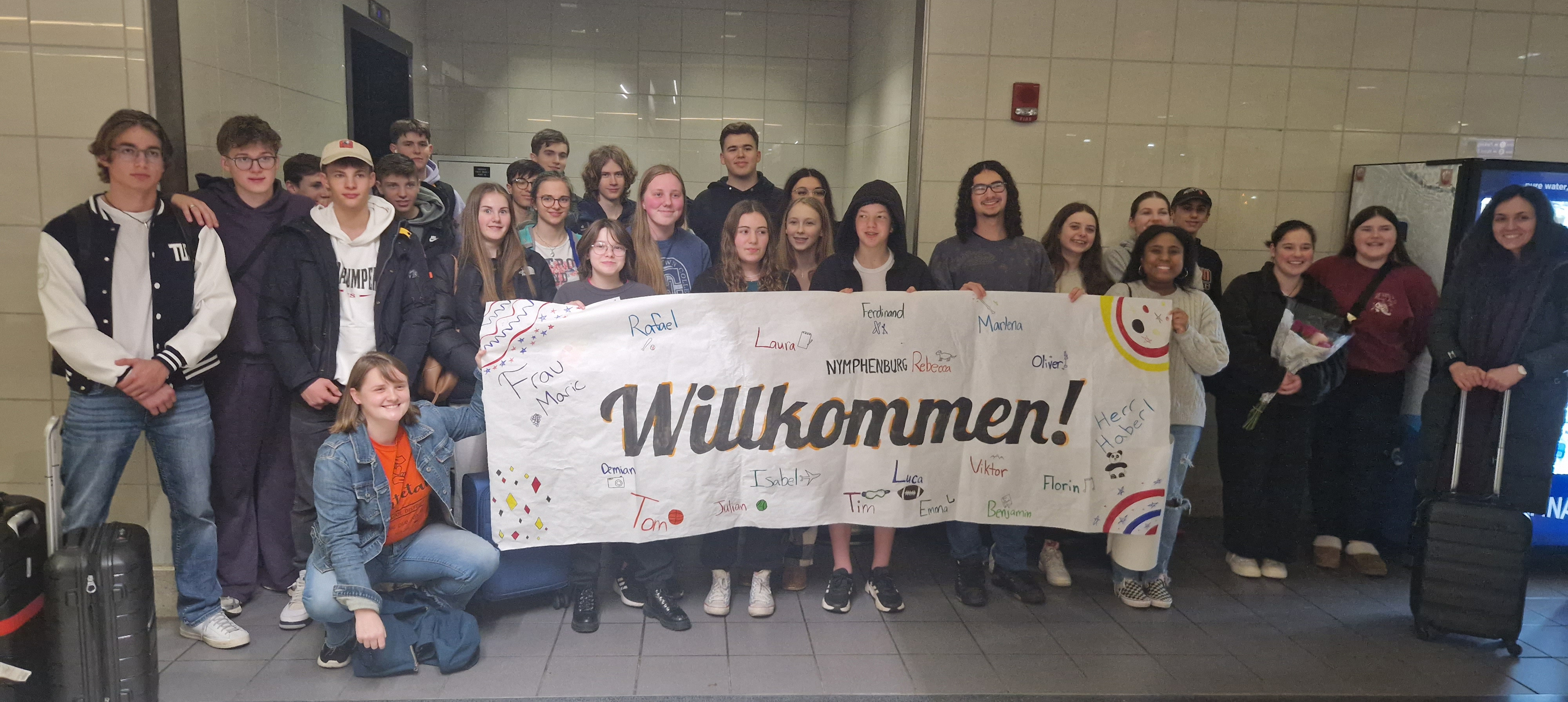 Dieses Schuljahr fand der erste USA-Austausch mit der Antietam Middle Senior High School in Reading, Pennsylvania statt. Wir, 16 Schülerinnen und Schüler der 10. und 11. Klassen und die Begleitlehrkräfte Frau Maric und Herr Haberl, waren alle schon ganz gespannt, was uns im Land der unbegrenzten Möglichkeiten erwarten würde, als wir uns am 9. März 2024 in der Früh am Flughafen München trafen. Nach fast 23 Stunden auf Achse, was man manchem schon leicht anmerkte, wurden wir bereits am Flughafen mit einem großen, toll gestalteten Plakat von unseren Austauschpartnern und Mrs. Ligas herzlichst begrüßt.