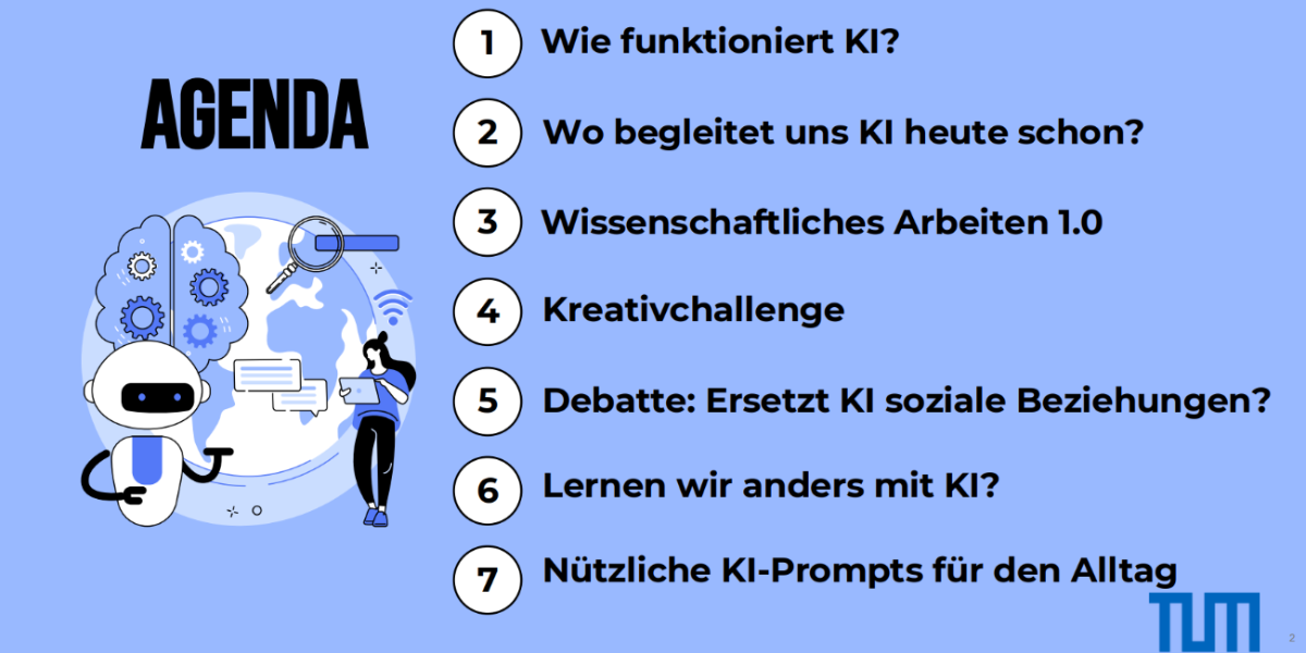 Wie reflektiert viele Schüler und Schülerinnen dennoch KI-Tools einsetzen, zeigte sich bei zwei Workshops, die wir vor kurzem in Zusammenarbeit mit dem Labor für experimentelle Wirtschaftsforschung an der TUM für interessierte Mittel- und Oberstufenschüler anbieten konnten. Die interdisziplinär angelegte Forschung im Labor untersucht die Effekte beim Menschen, wenn er ihm Rahmen seines Lern- oder Arbeitsprozesses KI nutzt. Angeleitet von zwei engagierten Studierenden ging es in einem kurzweiligen Programm um die Frage, welche Wirkung die Nutzung von KI auf die Lernmotivation, das Verständnis, das Engagement, die Kreativität und das kritische Denken der Lernenden hat. Im Nachgang folgt nun noch ein Laborbesuch für die Lerngruppe. Ein Filmbeitrag zum Thema „KI im Bildungsalltag“ als weiterer Ertrag dieser Zusammenarbeit ist derzeit in Planung.